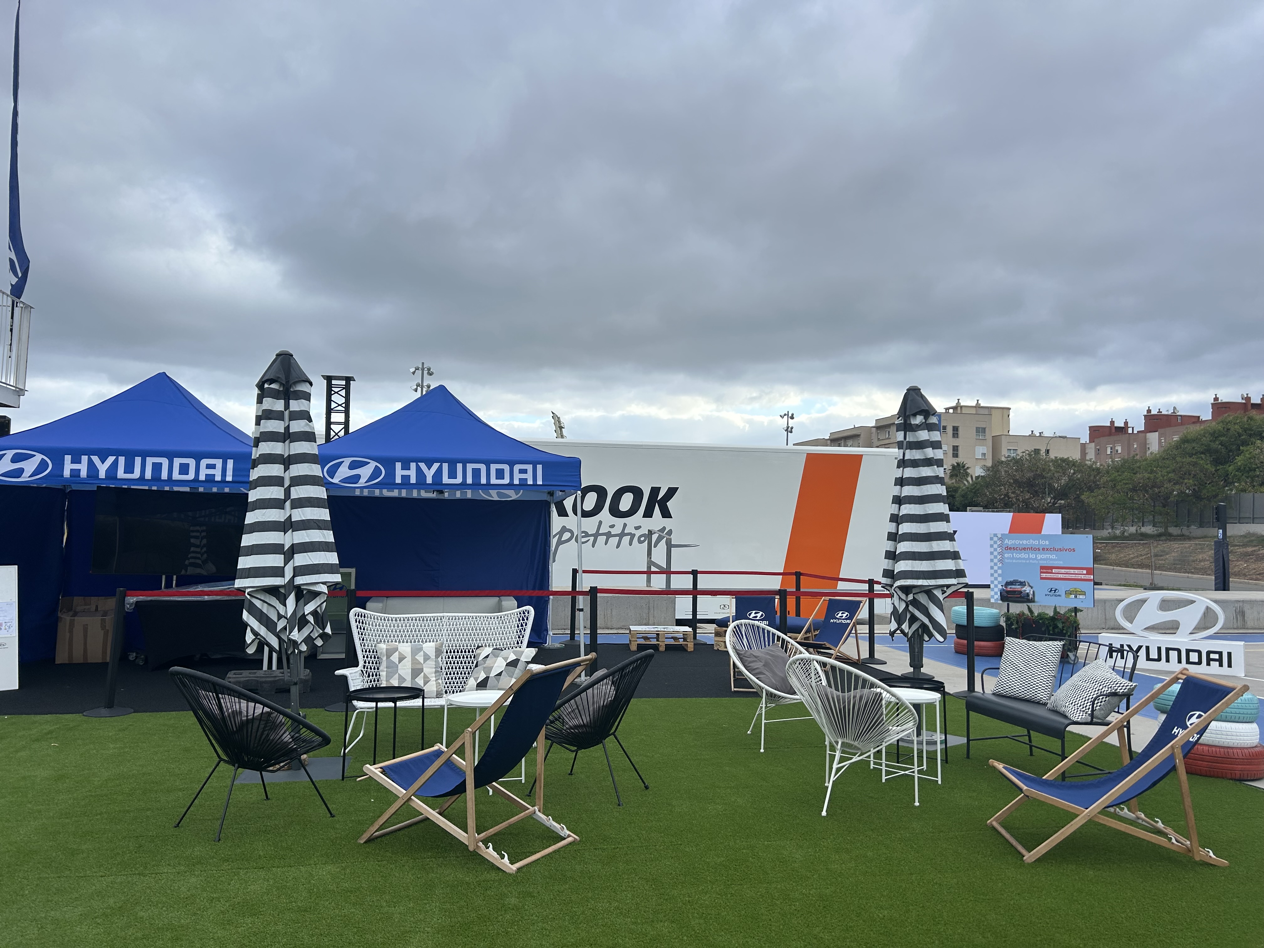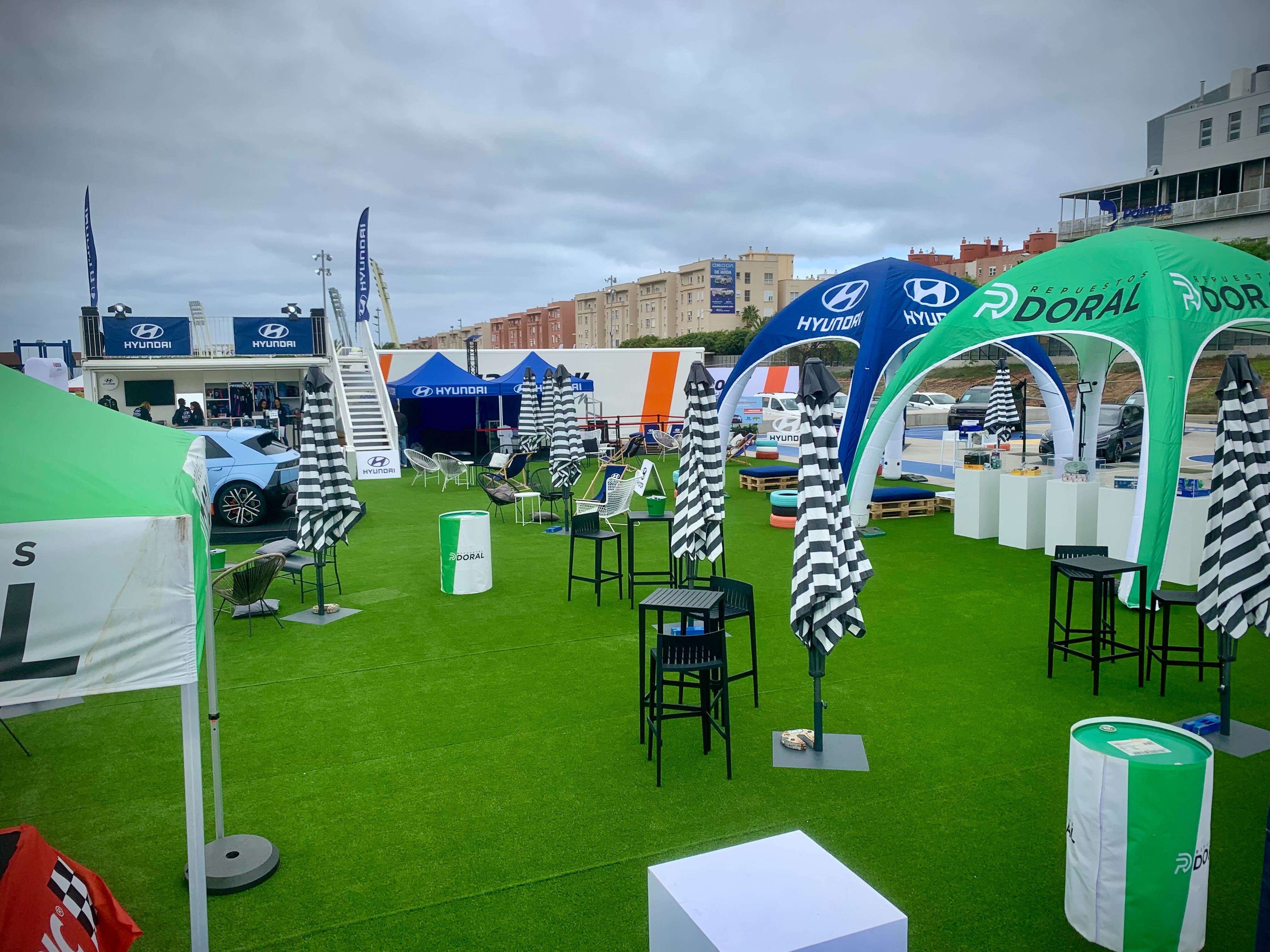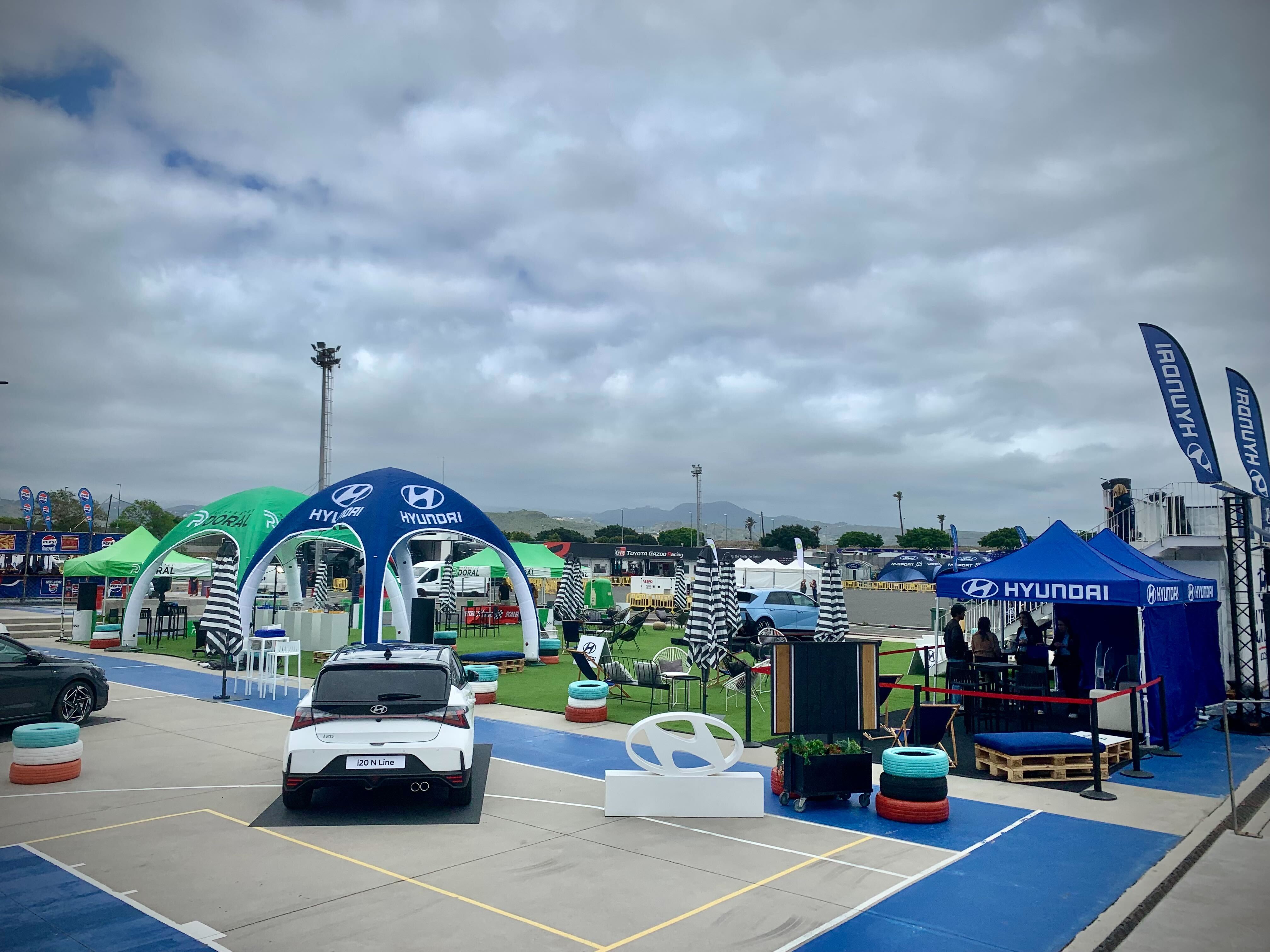 En 2025, con motivo del debut del 49 Rally Islas Canarias – Rally de España en el calendario del WRC, Hyundai Canarias confió en la agencia para dar forma a su presencia en la Fan Zone del Service Park, ubicada en el parking anexo al Estadio de Gran Canaria, activa del 21 al 27 de abril. Se diseñó el espacio de sponsor “Service Park Hyundai Canarias”: un paddock de marca con césped artificial, neumáticos de colores, carpas y estructuras hinchables, exposición de vehículos de la gama Hyundai, tienda de merchandising oficial Hyundai Motorsport, zona de descanso y ocio con mobiliario lounge y un simulador de rallies, todo atendido por personal y azafatas de la marca. El resultado fue un punto de encuentro muy visible y experiencial para los aficionados, que conectaba el espíritu competitivo del rally con el universo Hyundai en un entorno 100 % controlado por la marca.